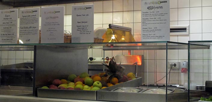 Flavors: Great variety of snacks 24 hours a day in the heart of Fira to accompany your coffee or juice. You will also find fresh salads, paninis, burgers, hot dog, donuts, and materials to make your own sandwiches and baguettes. Is an ideal for all hours of day and night. Modern space and urban air “blows” in this new snack point in the island. Sit on the chairs- swings overlooking the square.