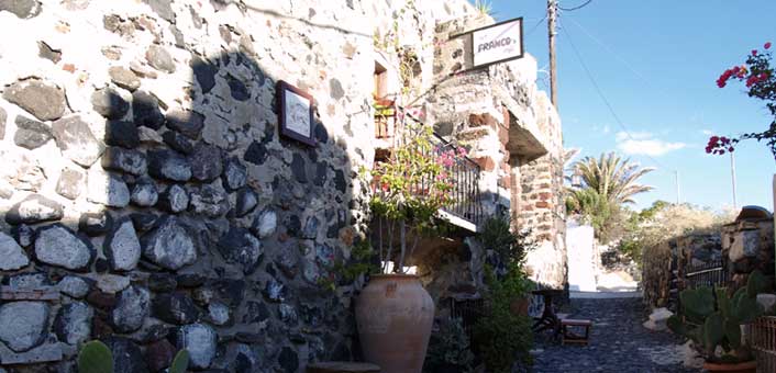 Atmosphere: Passing through the atmospheric village of Pyrgos sit on the patio of Franco's, opened by Franco, founder of the famous Franco's in Fira .
